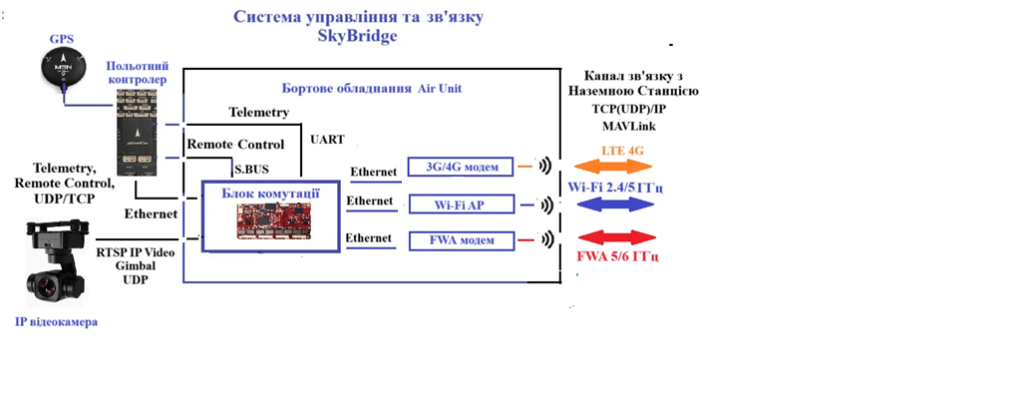 – Блоку комутації з інтерфейсами Ethernet, S.BUS, UART для зв’язку модулів Air Unit з польотним контролером та іншим обладнанням БпЛА.