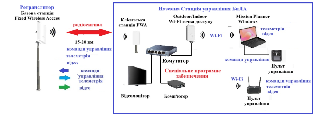 - клієнтської станції FWA зв’язку з БпЛА через Базову станцію FWA (ретранслятор);