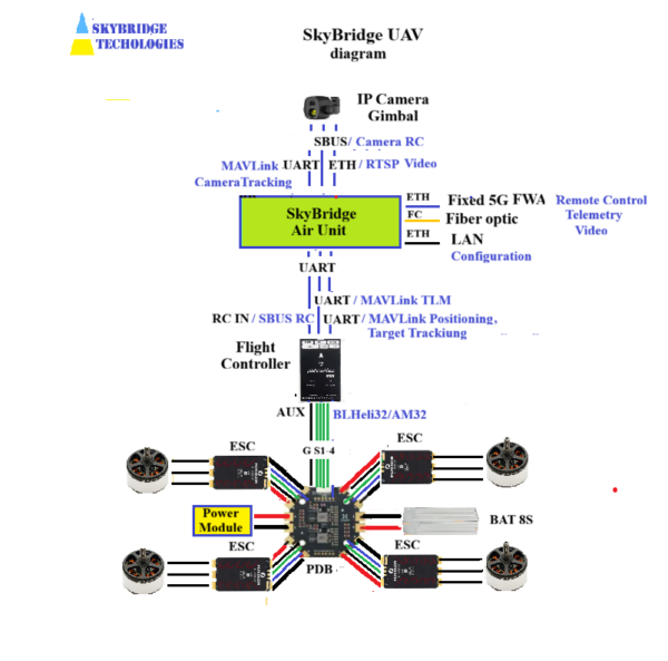 БПЛА SkyBridge побудовані на архітектурі ArduPilot із керування польотом, камерою, озброєнням та іншим бортовим обладнанням за протоколами SBUS/MAVLink, передачі телеметрії MAVLink, керування двигунами BDShot BLHeli 32.