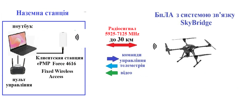 Наземна станція складається з клієнтського пристрою   Fixed Wireless Accces  (FWA) 6 GHz , ноутбука і пульта управління. На борту БПЛА розміщується плата (комунікаційний FWA модуль)  Fixed Wireless Accces 6 GHz з  антеною, з якої забезпечується  зв’язок   з Наземною  Станцією  на частоті 5925-7125 МГц .
