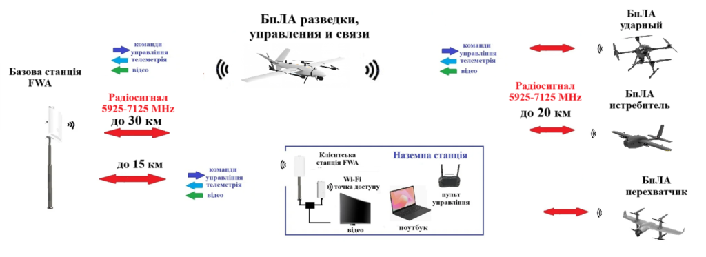 В якості ретранслятора Наземної Станції використовується Базова Станція Fixed Wireless Access  6 GHz, що забезпечує зв’язок   на частоті 5925-7125 МГц  з  до 120  БпЛА. Повітряним ретранслятором є БпЛА розвідки, управління і зв’язку, що забезпечує зв’язок  на частоті 5925-7125 МГц  в топології точка-багатоточка із загальною дальністю від Ретранслятора Наземної Станції до 50 км.